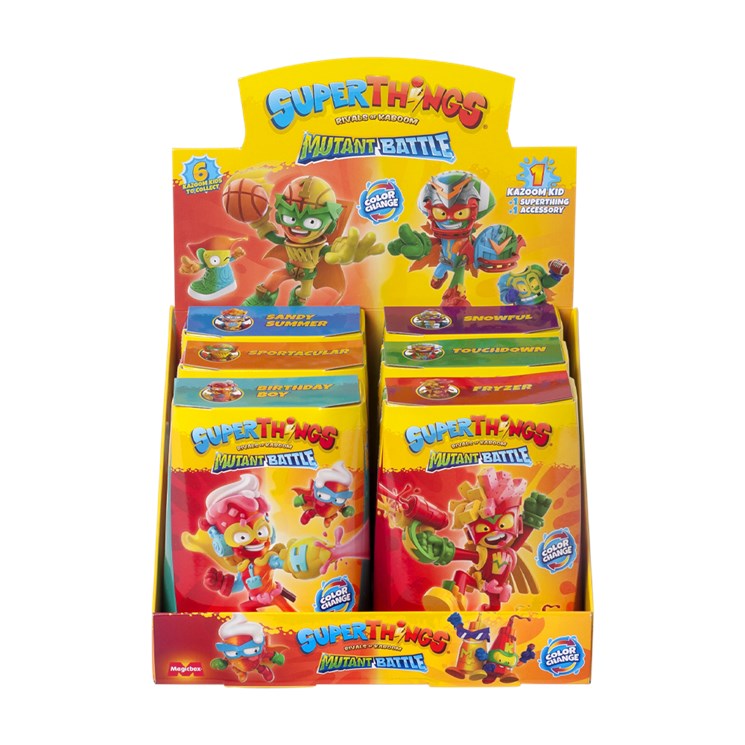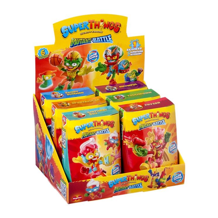 6 new Kazoom Kids that change colour with warm water. With articulated arms and legs. The accompanying SuperThing is exclusive and also changes colour.