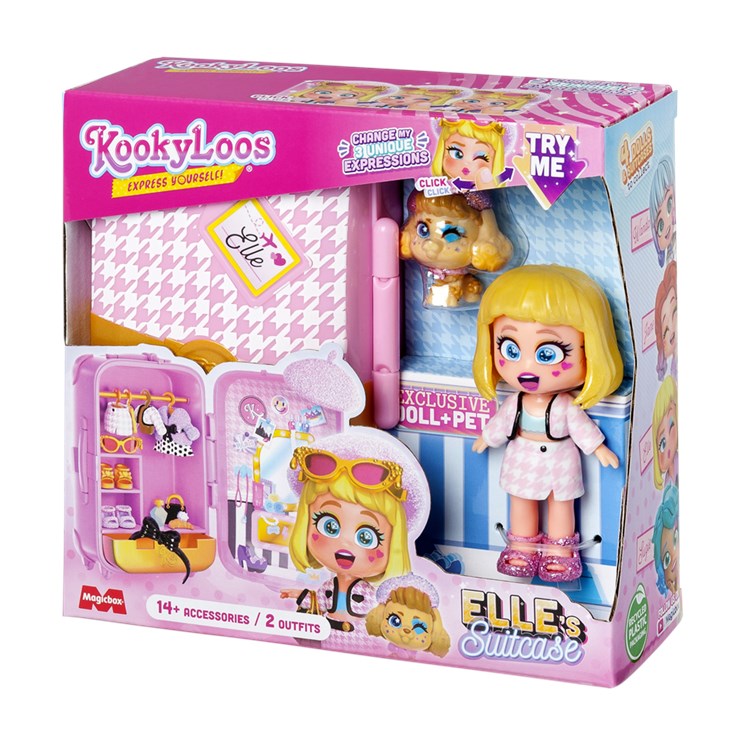 Maleta para muñecas con más de 14 accesorios de moda junto con la muñeca exclusiva Elle. ¡Descubre sus tres expresiones divertidas!