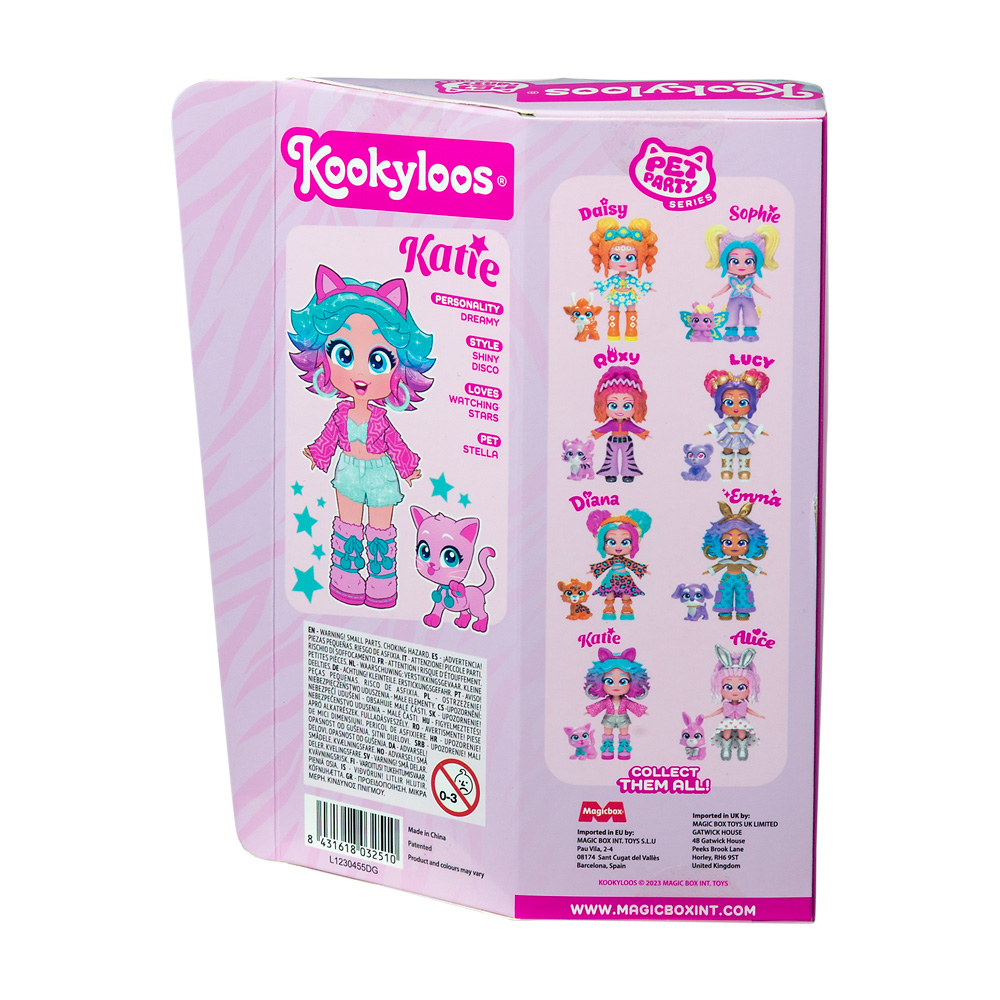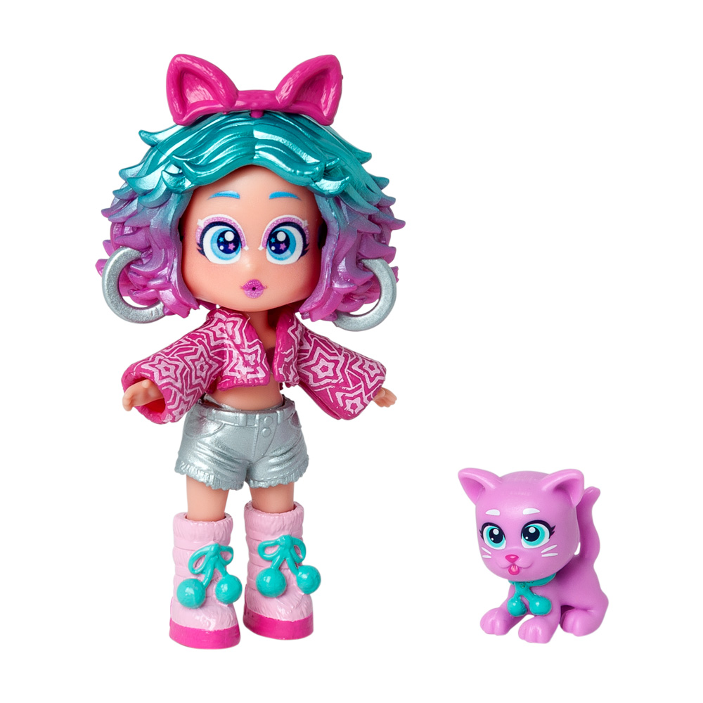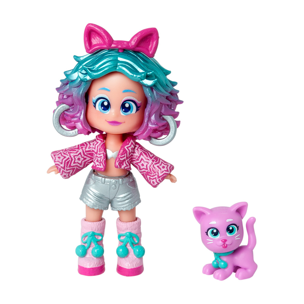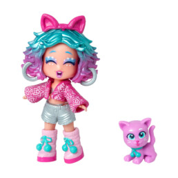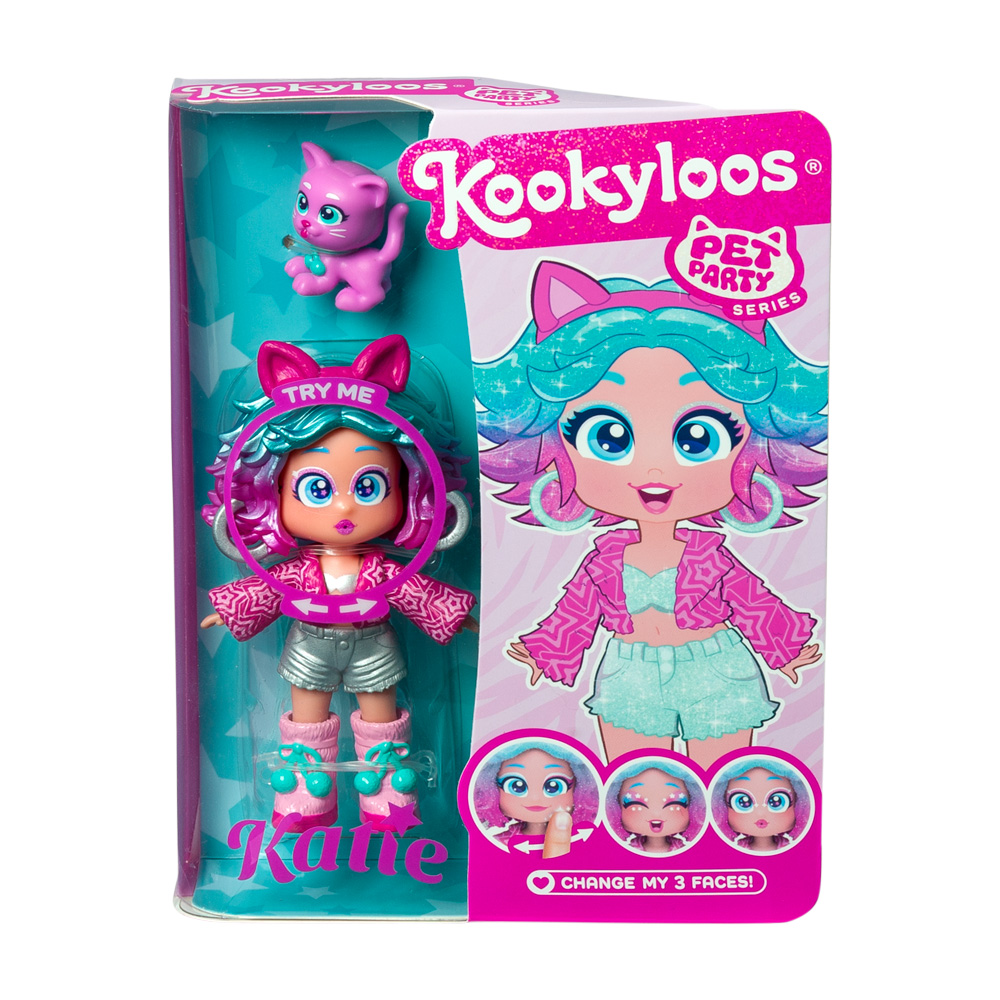 Muñeca coleccionable Katie con un gatito de mascota. Tiene su propia ropa y accesorios de moda ¡y tres caras diferentes!