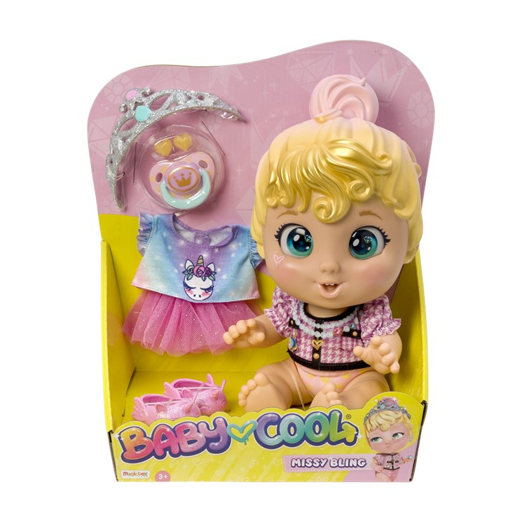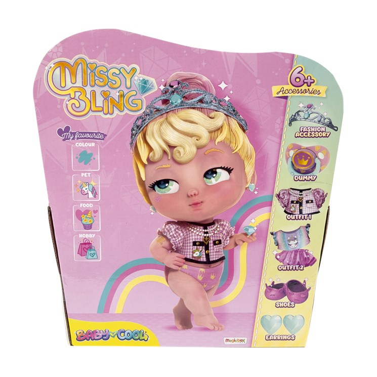 Missy Bling se acaba de mudar al barrio, y ya se ha convertido en la más elegante de las BabyCool.  A Missy le encanta la purpurina y los brillos, ¡nunca hay demasiado glamour! Le fascinan el dorado y el plateado súper brillante, por eso también colecciona pulseras y tiaras. ¡También le encantan los unicornios de peluche y los arcoíris! Sus colores favoritos son todos los tonos pastel y, por supuesto, el brilli-brilli.