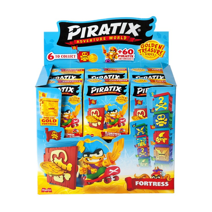 Colecciona los 6 diseños de fortines en varios colores. Resuelve la combinación secreta con el tesoro exclusivo para abrir la puerta y encontrar al Piratix sorpresa dentro.
