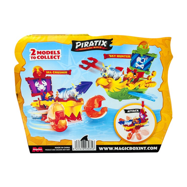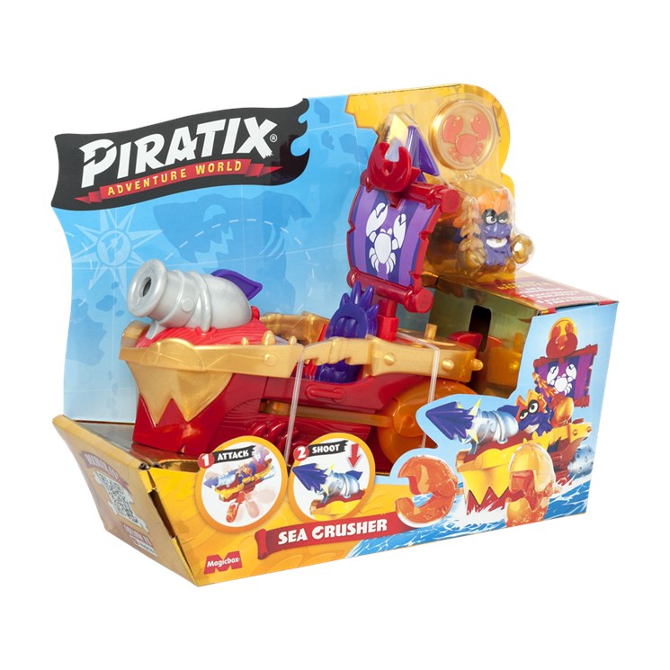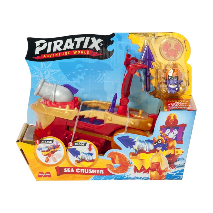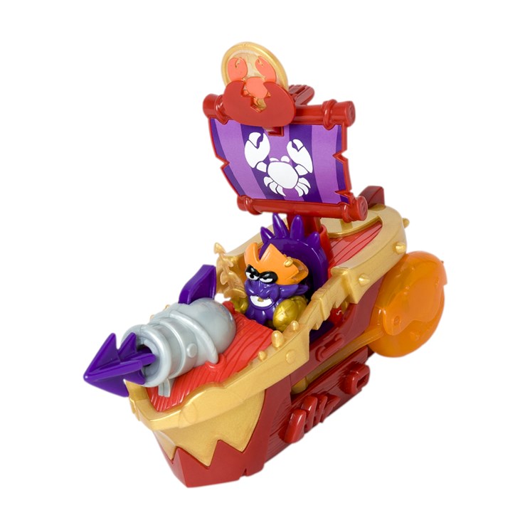 Barco pirata en forma de cangrejo con el Piratix exclusivo Captain Lobster. Usa su tesoro exclusivo para mover sus pinzas y disparar el cañón.