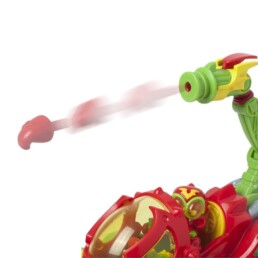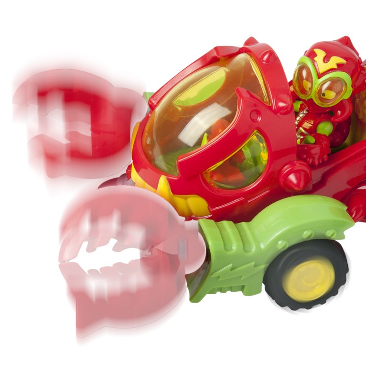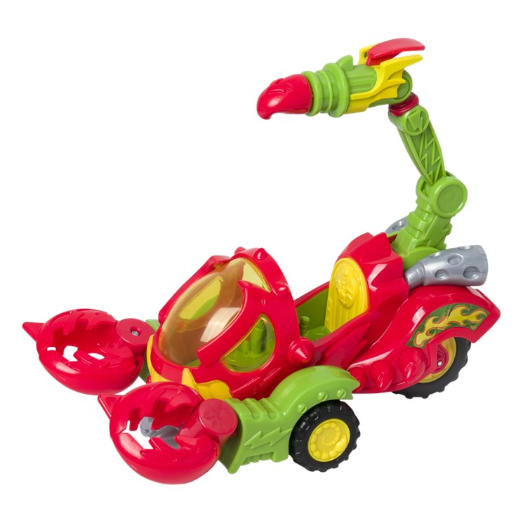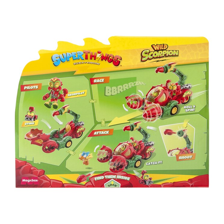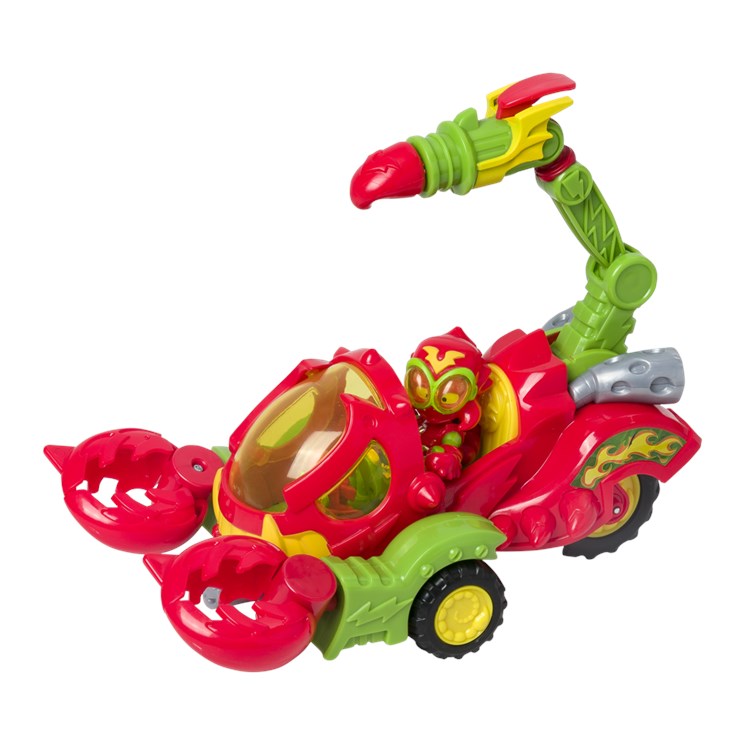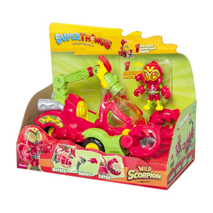 Vehículo escorpión que tiene un disparador y unas pinzas móvibles para atrapar a los héroes. Viene con 1 Wild Kid y 1 Wild SuperThing.