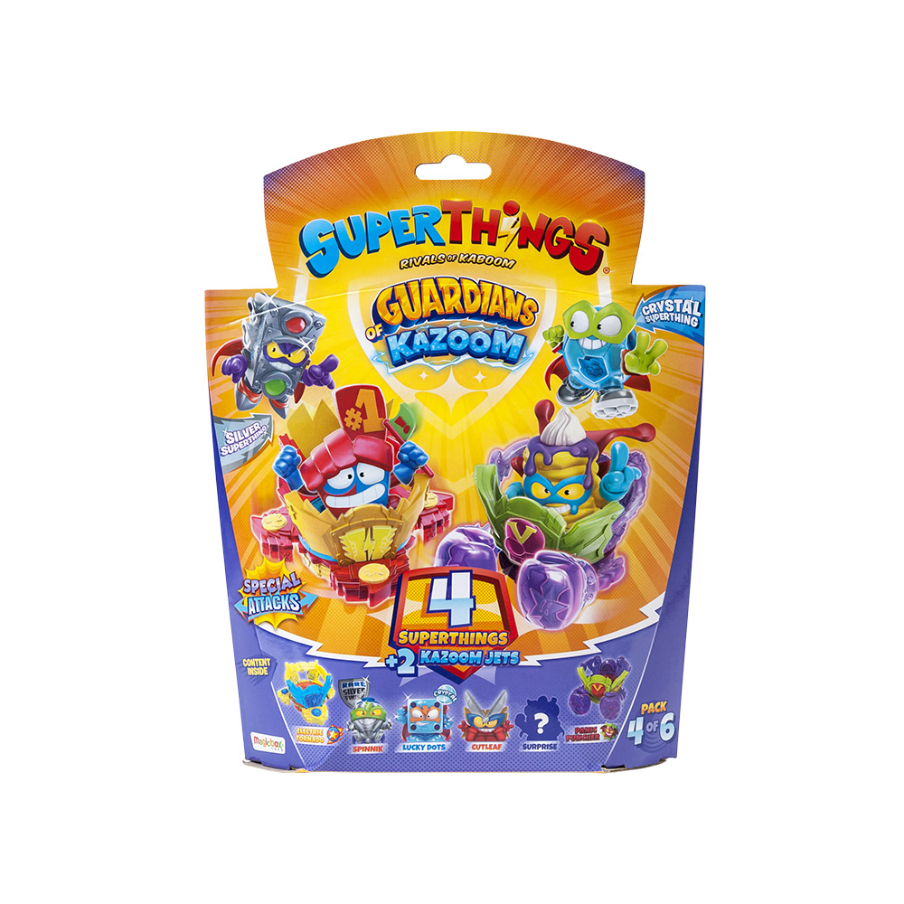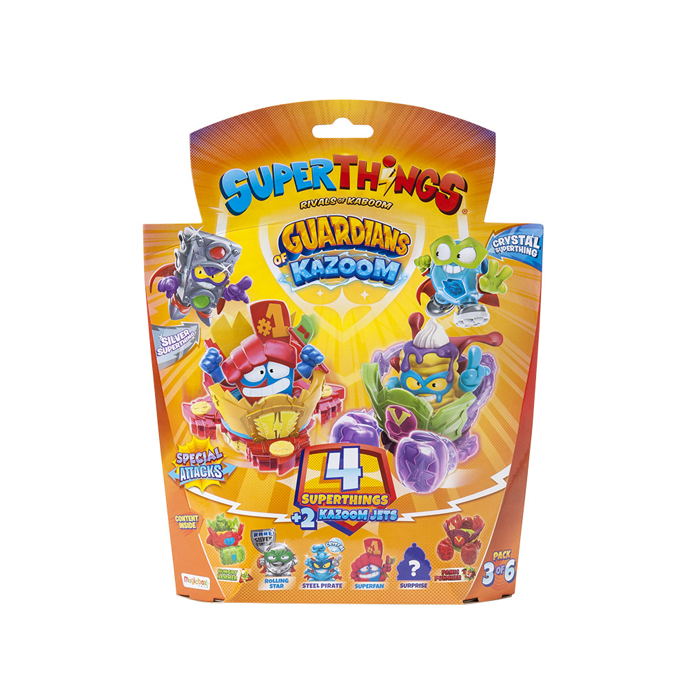 Coleciona 4 SuperThings da série Guardians of Kazoom (incluindo 1 figura prateada), bem como dois Kazoom Jets. Cada pack está numerado de 1 a 6 para que possas colecionar todos os Kazoom Jets.